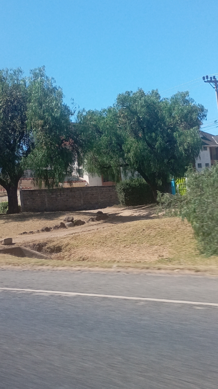 A roadside view captures a sunny, clear blue sky above green trees, some drooping, shading a beige, grassy area