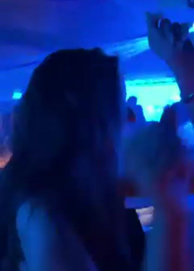 several people dancing in a nightclub. The lighting is predominantly blue. A woman with long dark hair is dancing with her arms raised. Other people are visible in the background, some standing at tables. The music is loud and upbeat.