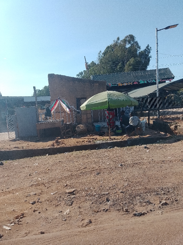This image captures a daytime street scene in Gura Top, Nigeria, under a clear blue sky. In the foreground, an unpaved, reddish-brown dirt road shows tire tracks and scattered small debris. Midground features include a low-rise, unpainted building with rough, earthy-toned walls and a partially damaged upper section on the left. Adjacent to this structure, a prominent green market umbrella is erected, providing shade. Beneath the umbrella, at least two individuals are present; one, wearing a light-colored shirt, is seated or crouching, while another is partially obscured. A blue bucket and various items, including red and white patterned fabrics, are visible near the base of the umbrella, consistent with a street vending operation. In the background, behind the immediate structures, a building with a dark corrugated metal roof bears a visible sign that reads "DON & DIVA Lounge." To the far right, a tall, white solar-powered street light pole stands. Dense green trees and foliage are visible further back, rising above the buildings and against the clear sky. The scene depicts a functional street environment with commercial and daily activities.