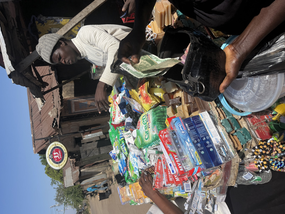The image depicts an active open-air market stall in the city of Jos, Nigeria, under bright daylight. A male vendor, wearing a grey knitted beanie and a ribbed long-sleeved white shirt, stands behind a makeshift counter laden with various goods. He is observed gesturing with his hands over the merchandise. To his left, another person's hand reaches towards a stack of packaged toothbrushes and toothpaste (brands 'MYMY,' 'Colgate,' 'Oral-B'). To the vendor's right, a third person's dark-skinned hand holds a fanned stack of Nigerian Naira banknotes, including a visible N500 note, over an open shiny black handbag. The stall displays a diverse inventory including packaged detergents ('Green Pro-Clean,' 'Diva'), various snacks, numerous bars of light brown and darker brown soap, and colorful beaded items. In the background, a street runs parallel to the market stall, where a person in a blue shirt is visible near a light blue cart or vehicle. Several structures with corrugated metal roofs and walls, some appearing aged or dilapidated, form the backdrop. A circular '33' EXPORT beer sign is prominently mounted on a pole against these structures. The sky is clear blue.