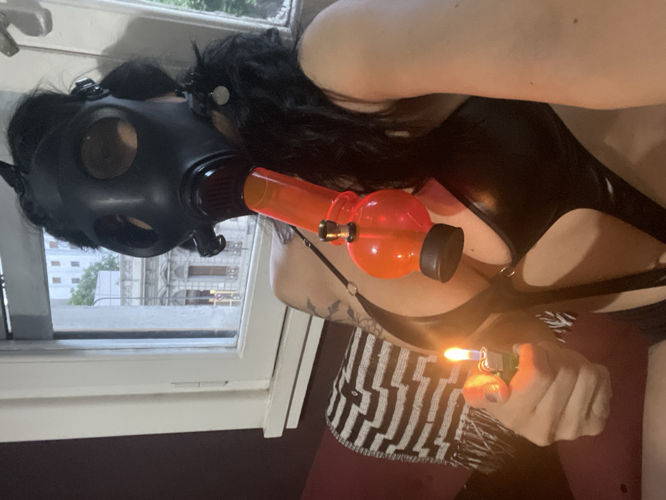 A person in a black latex outfit and gas mask holds a lit lighter to an orange bong. A tattoo is visible on their shoulder. The scene takes place indoors, near a window with a view of buildings. A black and white patterned object is also visible, possibly a blanket.
