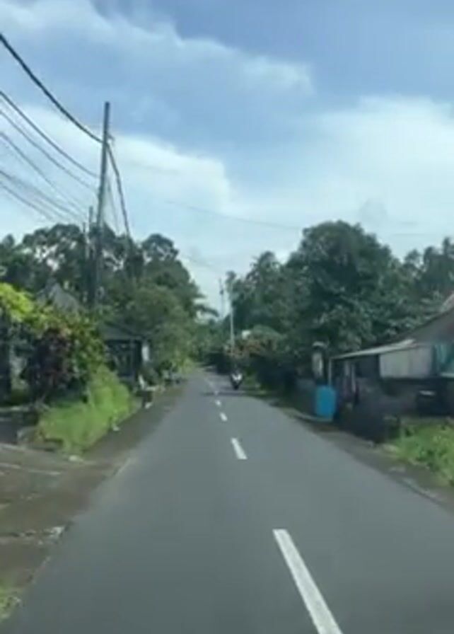 straight, black asphalt road with a single white line down the center. The road is surrounded by lush greenery, trees, and some small buildings on either side. Power lines stretch across the sky, which is partly cloudy. A single motorcycle can be seen riding down the road in the distance.