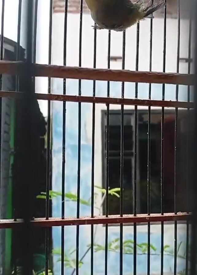 small, greenish-yellow bird perched on the top bar of a cage. The cage is made of dark metal bars with a wooden frame. Behind the cage, there is a blurred view of a building with blue and white walls, and some green plants. The bird is mostly stationary. The lighting is somewhat dim.