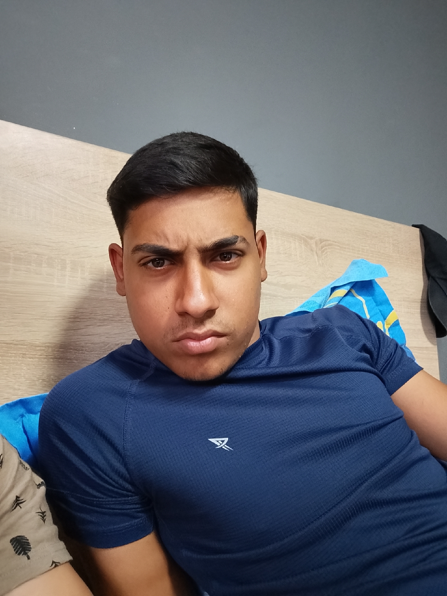 The image displays a young adult male, located indoors in Zagore, Bulgaria. He is positioned facing forward, looking directly at the camera with a serious expression, characterized by furrowed eyebrows and slightly pursed lips. The subject has dark, short hair and a light stubble on his chin and upper lip. He is wearing a dark blue, short-sleeved athletic shirt with a subtle textured pattern and a white, stylized logo on the left chest. Behind the subject's left side is a light brown, wood-grained surface, consistent with a headboard or wall panel. Above this wooden surface and extending across the upper background is a plain, medium grey wall. To the subject's right, a crumpled blue towel with yellow striping is visible behind his shoulder, and further to the right, a dark-colored garment is draped or hanging. A small portion of a light-colored fabric with dark, leaf-like patterns is present in the lower left foreground.