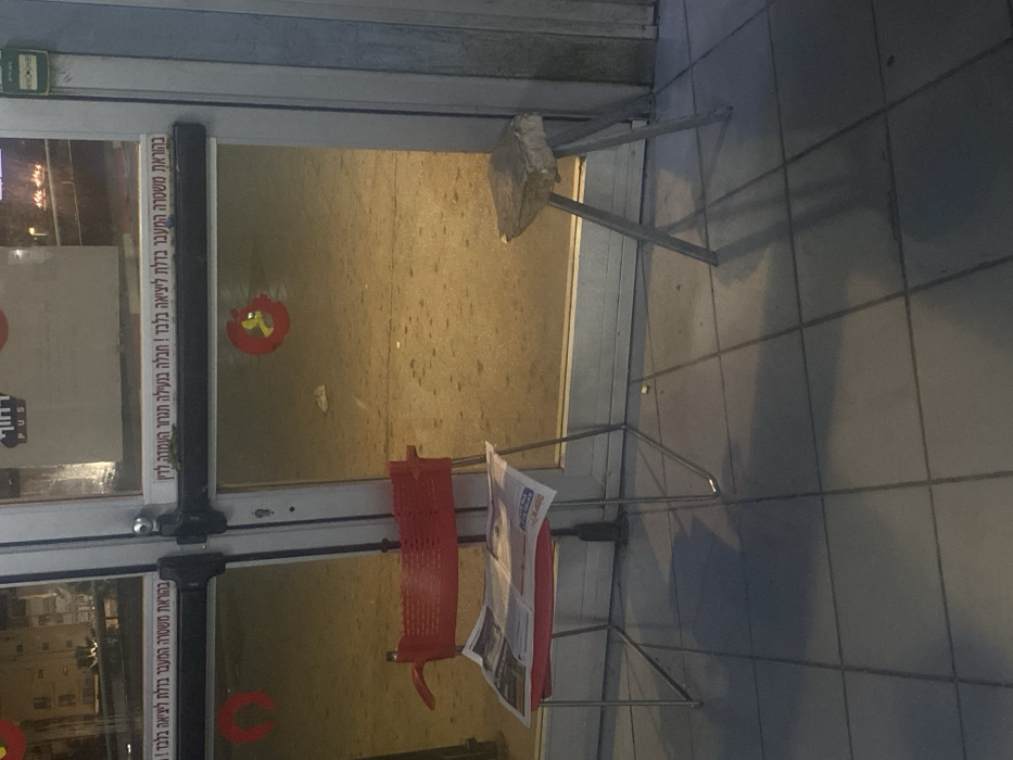doorway or entrance blocked by a chair with a newspaper and a rock on top of a metal frame. There's a sign on the door frame written in Hebrew, with the words "PUS" visible in Latin characters. The floor inside the doorway appears to be a concrete or similar material. The outside floor is made of dark tiles.