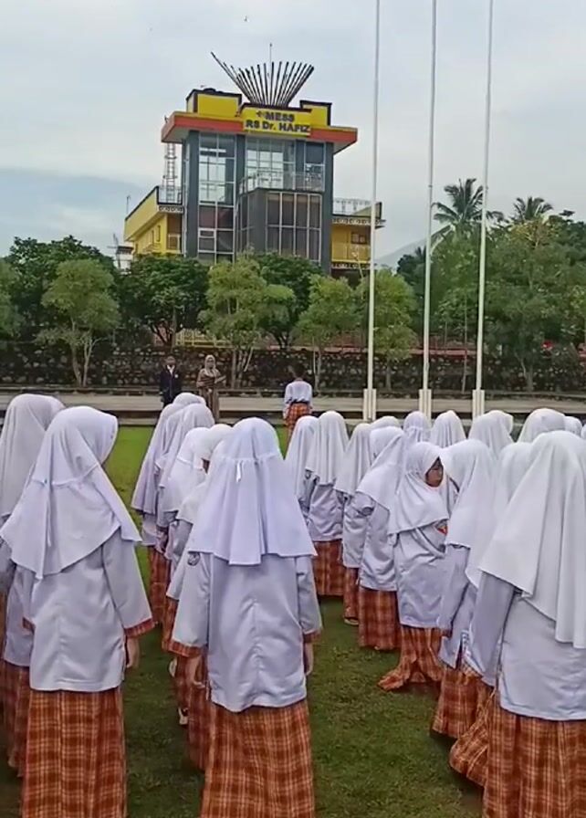 A group of young girls, dressed in matching uniforms of light grey jackets, orange plaid skirts, and white hijabs, are standing on a grassy field. Their backs are to the camera. They are arranged in rows, appearing to be in formation, possibly for a ceremony or event. In the background is a three-story building with a yellow and black exterior, a prominent sign reading "MESJ R.S. DR. HAFIZ," and what appears to be an observation tower on top. Several flagpoles stand tall to the right of the building, one with a red and white flag. Trees and other greenery border the field, and a faint mountain range is visible in the distance. The sky is overcast, casting a slightly diffused light on the scene. Two adult figures can be seen in the background, near the base of the building. The girls appear to be speaking, though the audio is unclear.