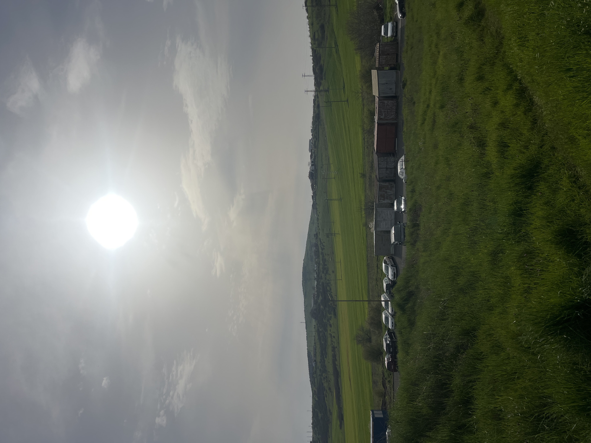 rural scene, likely in the vicinity of Burgas, Bulgaria. The landscape consists of green fields and a sloping hillside. A row of storage containers is visible along the side of the road or field. There are several cars parked near the containers. Overhead power lines stretch across the landscape. The sky is partly cloudy, with the sun shining brightly.