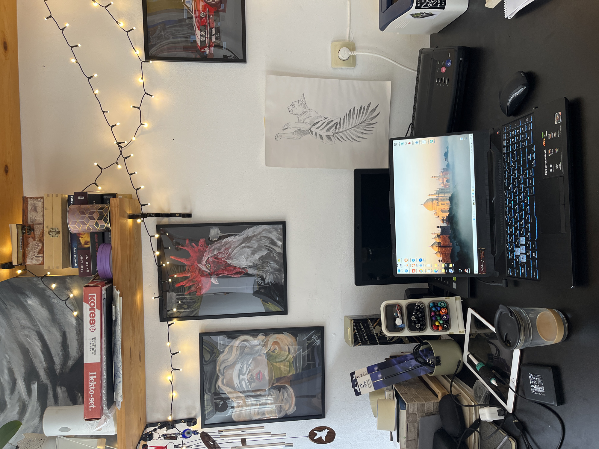 An indoor workspace in Plovdiv, Bulgaria, is depicted, featuring a black desk and a wooden shelf against a white wall. The desk is occupied by numerous items. On the left, a black external hard drive, a white tablet with a stylus, black headphones, various cables, and a wicker basket holding books are present. A tall, light green pen holder, a Johnnie Walker Black Label whiskey can, and a multi-compartment white organizer filled with colored pens and markers are also on the left. Centrally, an open black ASUS TUF Gaming A15 laptop displays an image of the Taj Mahal. A clear glass travel mug with a black lid, containing a beige liquid, sits next to the laptop. To the right of the laptop, a black wireless mouse, a black laminator, and a white and blue printer with a "BASIC INK TATTOO PLOVDIV" sticker are visible. A small white spiral notebook and a pen complete the right side of the desk. The white wall above the desk features a string of decorative LED lights. Hanging on the left are metal wind chimes and a wooden bird cutout. Three framed artworks are displayed: a blindfolded woman with blonde hair, a rooster with a red comb, and a red classic car. A pencil sketch of a cat on a large leaf is taped to the wall near a beige electrical outlet. On the wooden shelf above, from left to right, a white air diffuser, a large abstract painting, a red "Kores Hekto-set" box, stacked wooden boxes, a purple cylindrical object, and several books, including one by Leonardo da Vinci, are arranged. No individuals are present in the scene.