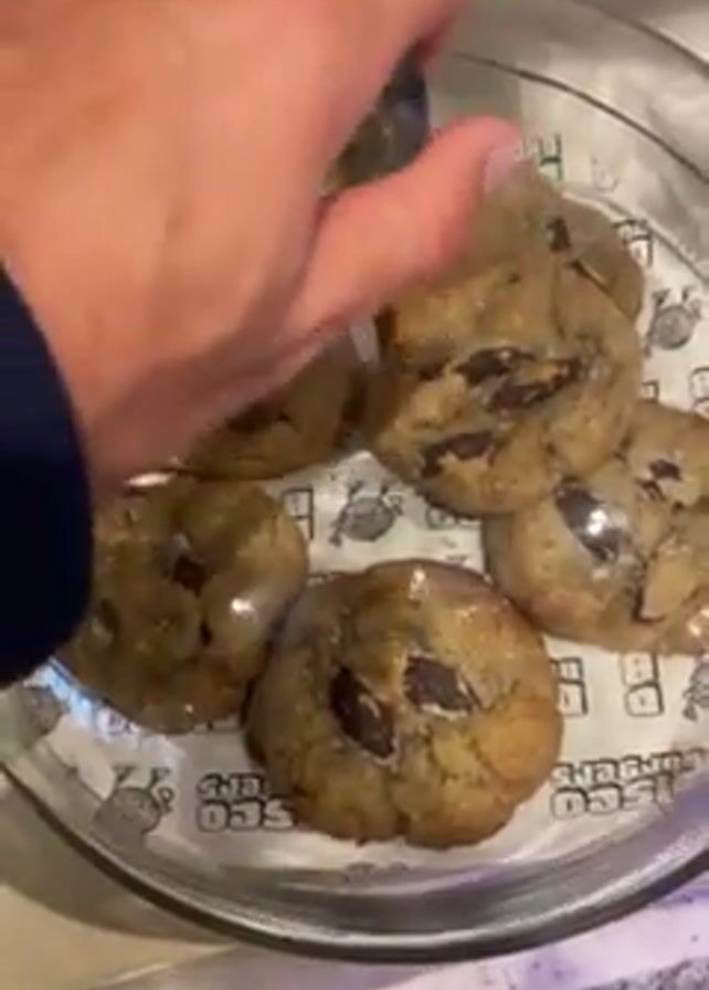 A hand removes a glass dome from a plate holding five chocolate chip cookies