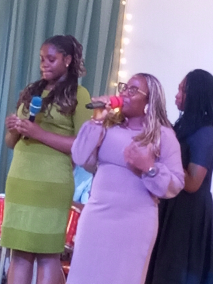 Three females are depicted indoors, in the city of Jos, Nigeria, engaged in a performance or public speaking event