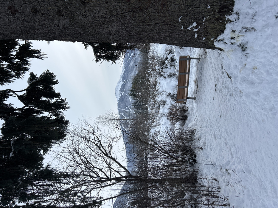 A snowy scene features a wooden bench positioned amidst snow-covered bushes and trees. A large tree trunk frames the upper portion of the image. In the background, a snow-capped mountain rises against an overcast sky. Bare branches reach towards the sky. The ground is entirely covered in snow, highlighting a wintery, quiet landscape.