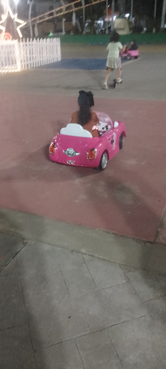 A young girl with dark hair sits in a pink toy car on a red paved surface. The car faces away from the camera. Another child on a scooter is visible in the background, moving to the right. In the distance, there is a lighted white picket fence and some trees. The bottom of the frame shows a gray, tiled surface. It appears to be an outdoor evening scene.