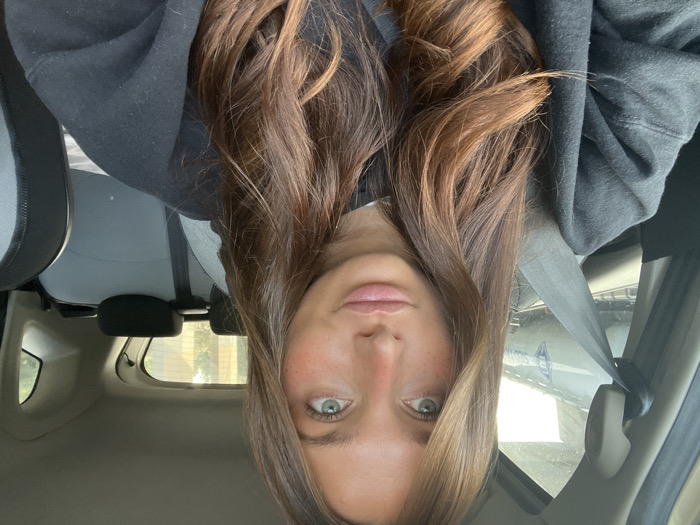 A young adult female is depicted in a selfie taken from the front passenger seat of a vehicle
