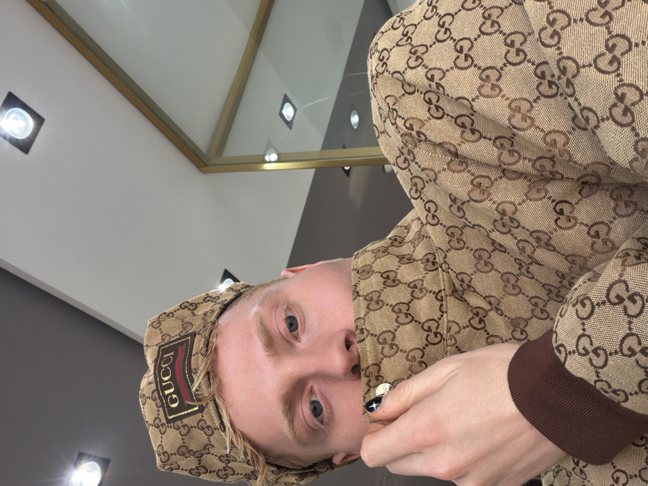 A light-skinned individual, likely male, with fair hair and visible blue eyes, is depicted in a close-up indoor photograph. The subject wears a matching beige-and-brown monogrammed Gucci ensemble, consisting of a high-collared jacket and a brimless cap with a prominent "GUCCI" logo patch. The left hand, adorned with dark nail polish featuring a white star design on the index finger, pulls the jacket's collar up, partially obscuring the lower face. The background consists of a white ceiling with multiple square recessed downlights and a reflective surface, possibly a mirror or glass display, framed by a brass-colored border on the right. The setting is consistent with a luxury retail environment, specifically a Gucci store. No specific address or landmark within Istanbul, Turkey, is discernible from the image, only that it is a Gucci retail location in the city.