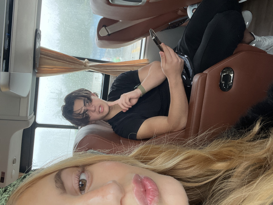 The image displays two individuals inside a passenger vehicle, likely a bus or shuttle, under overcast or rainy conditions
