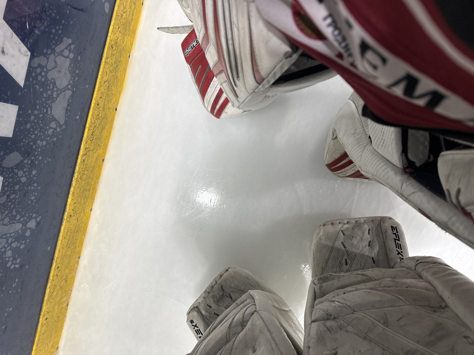 The scene depicts an overhead view inside an ice hockey rink, specifically identified as the Hrodna Ice Palace (Ledovy Dvorets) in Hrodna, Belarus. This identification is based on the prominent partial "ГРОДНО" (Hrodna) inscription visible on the upper dark-blue dasher board in the background. The dasher board includes a yellow kick plate and exhibits scuff marks and white splatter patterns. The ice surface is white, showing minor skate abrasions and reflections from overhead lighting. In the foreground, two distinct sets of ice hockey goalie leg pads are positioned on the ice. On the left, a pair of worn white pads with "EFLEX 5" branding is visible. On the right, a second pair of worn white pads with red vertical stripes is present, featuring "GENETIK" branding near the top and "CCM" visible on the inner boot area, along with faint "MOLNIYA" text on a red stripe. No individuals are fully visible; however, the arrangement indicates the presence of two ice hockey goalies or their equipment on the ice surface.