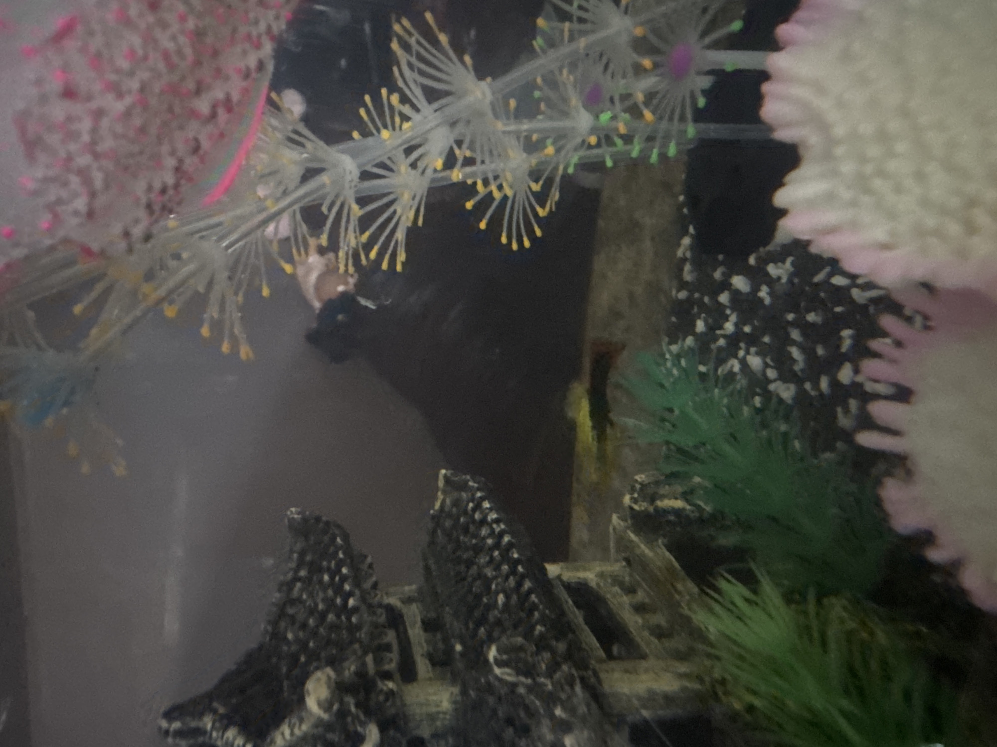 The image displays the interior of an aquarium. No specific city location within Unknown, Unknown is discernible as the scene is contained within an artificial aquatic environment. The foreground and mid-ground feature various decorative objects. On the left, a multi-tiered pagoda-style resin ornament, primarily grey and beige, stands with textured roof sections. To the right, a tall, translucent white plastic plant with numerous thin stalks terminating in yellow spherical tips occupies the central right. A larger, out-of-focus, textured pink and white decorative object is in the lower right foreground. In the upper right, another plastic plant with pink speckles and a blue tip is partially visible. The tank's substrate is dark gravel mixed with small white stones. Several green, feathery plastic plants are situated in the lower-left and mid-ground. One small, pale-colored fish or aquatic creature is faintly visible in the upper-right mid-ground, positioned behind the translucent white plant. A small, reddish-brown object, possibly a snail or a small fish, is present in the lower-left mid-ground, near the base of the pagoda. The background is dark and out of focus.