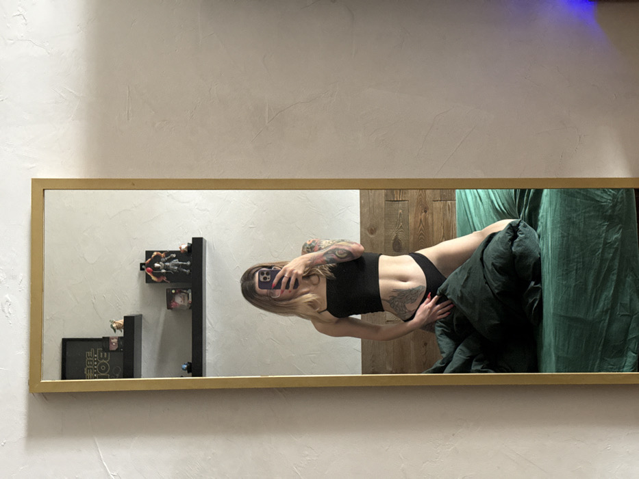 A full-length, gold-framed mirror reflects an indoor scene, likely a bedroom. An adult female, with blonde hair and glasses, is visible in the mirror's reflection. She is wearing a black spaghetti-strap crop top and black briefs. Tattoos are present on her left arm and lower abdomen. She holds a smartphone in front of her face, obscuring it, while posing for a mirror selfie. She is positioned on a bed covered with dark green bedding, with her left hand resting on a dark green duvet. Behind her, a wooden headboard with horizontal brown planks is visible. The walls, both reflected and directly visible, are light-colored and textured. Two black floating shelves are mounted on the wall above the headboard in the reflection. The upper shelf displays a framed item and small figurines, including one resembling Grogu. The lower shelf holds another framed item and a figurine resembling Pennywise. A faint blue light emanates from an unseen source to the right of the mirror, illuminating the wall. The specific location within the city of Reutov, Russia, cannot be determined from the image content.