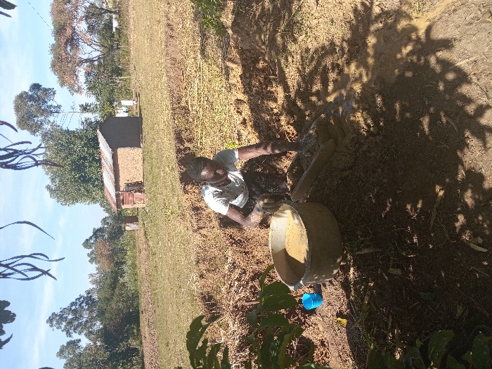 A man labors outdoors, likely working with mud or clay. He is situated in a dirt area with foliage visible, possibly a garden or field. He wears a light-colored shirt and appears to be digging or mixing something with his hands. A bucket sits nearby, containing a muddy substance. A small blue container is also visible near the bucket. In the background, a building and surrounding trees add context to the scene. The image is slightly rotated, with a tree branch framing the left side.