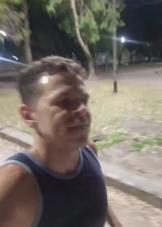 man running in a park at night. He is wearing a dark tank top with a grey trim. His skin appears sweaty or damp. The park has trees and streetlights. The ground is covered in grass and paved pathways. The camera is held by the man, pointing towards his face as he runs.