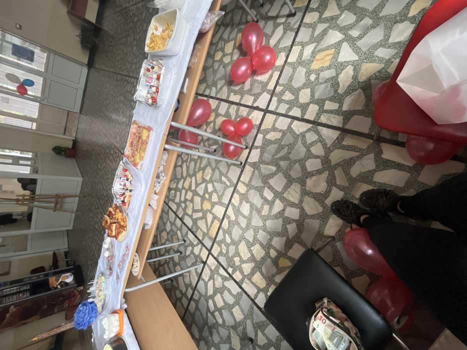 The scene depicts an indoor social gathering or celebration in Veliko Tarnovo, Bulgaria. In the immediate foreground, a person's lower legs and feet are visible, clad in black pants and black sneakers, standing on a patterned tile floor. To the left, a black office chair holds a floral-patterned pouch containing several banknotes, identifiable as Euro denominations. The floor features irregular, light-colored flagstones or terrazzo tiles separated by dark grout lines, forming a grid. In the midground, a long, light-colored folding table, covered with a white tablecloth, is laden with various food items. From left to right, these include an orange container with white items, a blue decorative pom-pom, a tiered stand with cake pops or lollipops, a plate of small pastries, a large rectangular pan of savory pastry (possibly banitsa), an aluminum tray with skewered appetizers (e.g., cherry tomatoes, mozzarella), a large pan of layered dessert, another aluminum tray with small colorful items, and a white dish containing fried potato snacks. Red balloons are scattered on the floor around and under the table. The background reveals an interior hallway or open common area. On the far left, a tall vending machine or display cabinet is visible. Towards the center-left, a wooden easel stands. Behind the food table, through a glass partition of an office or cubicle area, two indistinct figures are seated at a desk. Further into the background, white doors and window frames suggest an outdoor connection or a well-lit interior, with additional red and blue balloons hanging near a distant doorway. A potted plant is situated near a doorway on the right side of the background.