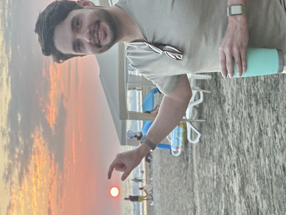 A man smiles, wearing a light green shirt, sunglasses, and two watches. He holds a turquoise tumbler. Behind him is a beach with a tent, chairs, and people in the distance. The sky shows a vibrant orange sunset with clouds. He's playfully "pinching" the sun between his fingers, creating an illusion.