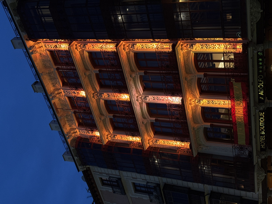 A building at night, illuminated with warm orange light, showcases multiple floors with windows and ornate detailing. The upper floors have wrought-iron balconies. A Spanish flag hangs near the corner, next to a sign that reads "HOTEL BOUTIQUE ADOLFO" with star ratings. The sky is a dark blue, creating a contrast with the lit facade. Architectural elements are emphasized by the light, highlighting their elaborate designs.