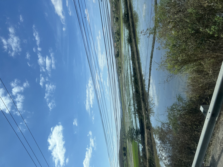 Paddy fields extend horizontally across the midground, filled with water, reflecting the sky. A strip of greenery separates the fields from a vegetated area on the right edge of the image. Power lines stretch across the sky on the left, a bright blue filled with scattered white clouds. A gray metal railing is visible in the bottom right corner. The scene conveys a rural landscape under a sunny sky.