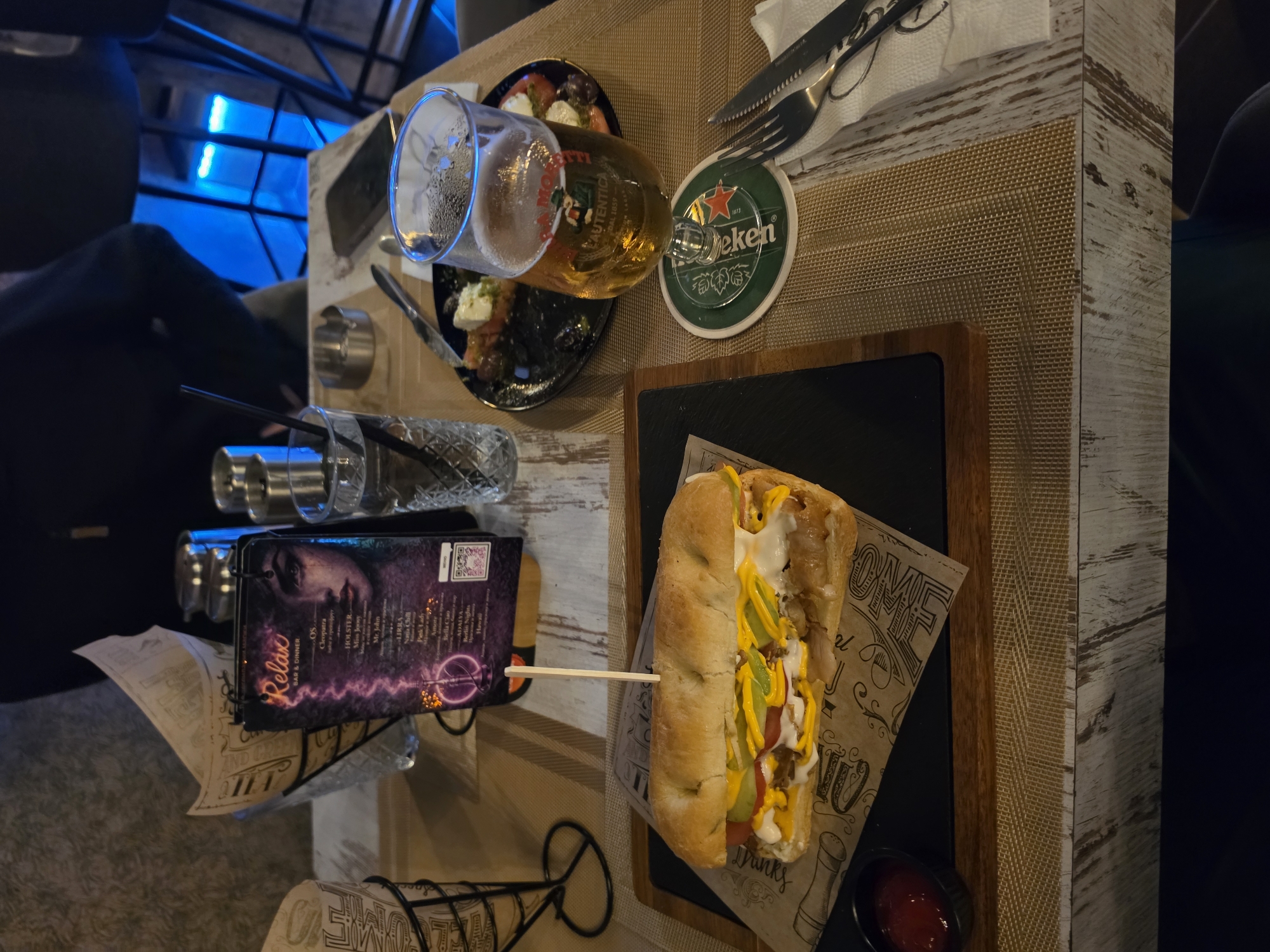 An overhead view captures a dining scene at "Relax Bar & Dinner" in Dimitrovgrad, Bulgaria. The primary subject is a large sub sandwich, skewered and presented on patterned paper atop a black rectangular plate and wooden board. The sandwich contains multiple layers of meat, two distinct sauces (yellow and white), sliced green elements, and red elements. To the left of the sandwich is a small black ramekin containing red sauce. A menu titled "Relax Bar & Dinner" stands upright behind the sandwich, displaying cocktail names and a graphic of a woman. Adjacent to the menu, a clear glass with water, ice, and a black straw is visible, alongside a metallic ashtray. A dark-colored smartphone rests further back on the table. To the right, a black plate holds partially consumed salad items, including feta cheese, tomatoes, and olives. A stemmed beer glass, containing a light amber liquid and displaying "CA' MORI L'AUTENTICA DAL 1859" branding, sits on a green "Heineken" coaster. Cutlery, including a fork and knife, rests on a white napkin beside the beer glass. The table surface is a light, distressed wood, partially covered by a woven tan placemat. In the blurred background, a person's arm is visible on the left, and another person's torso and arm are visible on the right, seated on a dark chair with a blue neon light feature in the distant background.