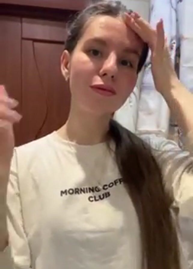 A young woman with long brown hair in a ponytail is in a bathroom. She's wearing a white long-sleeved shirt with "MORNING COFFEE CLUB" printed on it and a silver necklace. She is applying a clear substance to her face, starting with her forehead and then moving to her cheeks and chin. Behind her is a brown wooden cabinet, a shower curtain with a faint abstract design, and a tiled wall. The bathroom sink appears to be running.