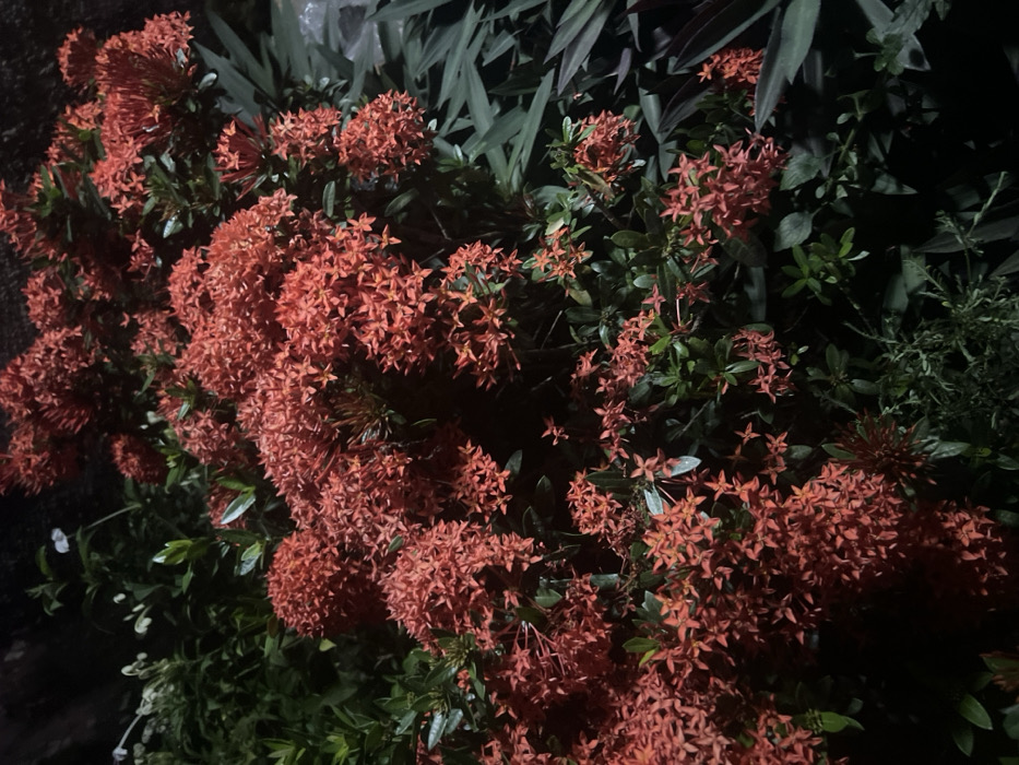 A vibrant cluster of reddish-orange Ixora flowers dominates the scene, their tiny blooms densely packed together. Lush green foliage surrounds the blossoms, providing a contrasting backdrop. In the background, dark, elongated leaves add depth and texture. The lighting appears dim, casting shadows that enhance the textures and contours of the plants. Overall, the image captures the beauty and intricacy of a tropical garden at night.