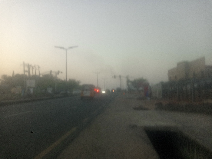 A hazy, muted scene captures a wide street, flanked by buildings and streetlights. Vehicles, including an orange vehicle, are vaguely visible amidst the dense haze. Structures on the sides blend indistinctly, with buildings and vegetation adding layers. A sidewalk borders the street on the right, exhibiting a drain and concrete structures. The air is thick with haze, obscuring distant details.