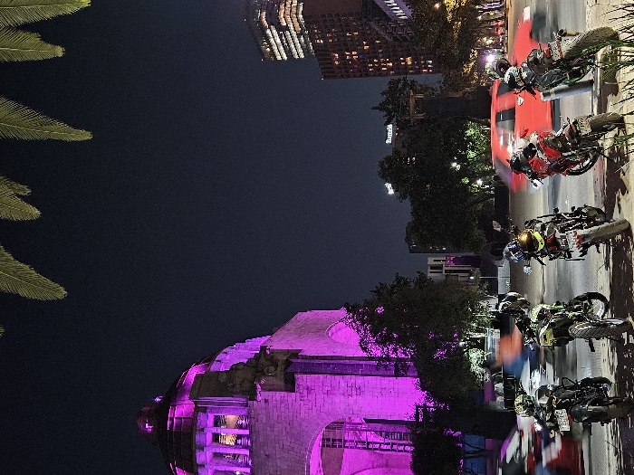 This image depicts an urban night scene in Mexico City, Mexico, centered around the Monumento a la Revolución, located at Plaza de la República
