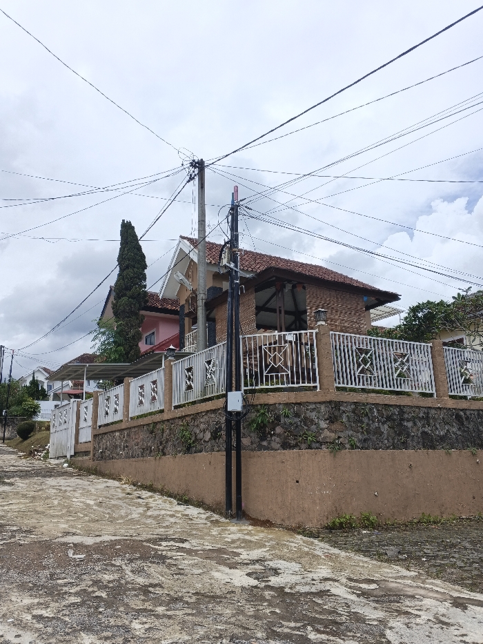 A cloudy sky hangs over a street scene featuring a multi-level house behind a white fence atop a stone and stucco wall. The house showcases a tiled roof and a partially visible pink section. Overhead, power lines crisscross the sky. A black utility pole stands prominently in the foreground, with a box attached to it. The weathered road shows signs of cracking and wear.