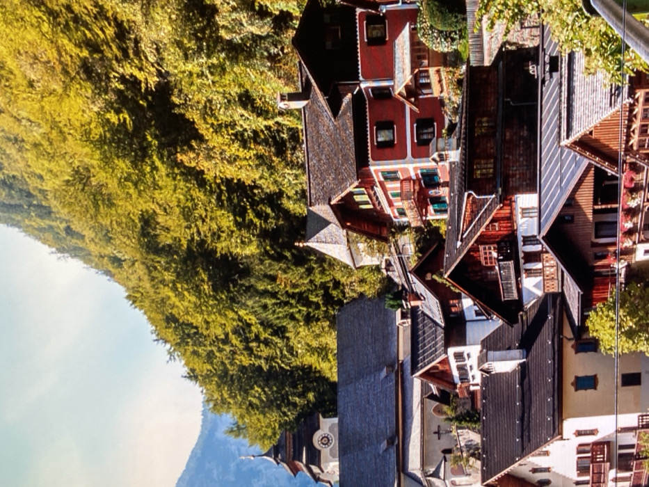 An elevated, angled shot captures a charming village nestled against a forest-covered mountainside