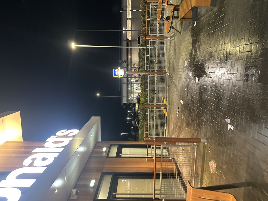 The image depicts the exterior of a McDonald's restaurant at night, specifically located at the Fife Central Retail Park, Halbeath, Dunfermline, United Kingdom. The foreground shows a wet, brick-paved outdoor seating area directly outside the McDonald's building, which features a prominent, illuminated "McDonald's" sign with white lettering against a dark background. The building itself has wooden paneling and large glass doors. A white security camera is mounted on the building's exterior. The seating area contains at least two wooden benches with integrated tables; one is partially visible in the lower left, and another is visible on the right. The ground is littered with various discarded items, including wrappers, paper, and plastic debris, and reflects light from overhead sources, indicating recent rainfall or wet conditions. A metal grid fence with wooden posts delineates the outdoor dining space. In the mid-ground, a tall streetlight illuminates the area, and beyond the fencing, another building is visible. In the background, across what appears to be a parking area or road, a brightly lit Aldi supermarket is identifiable by its distinctive blue and yellow "ALDI" logo. Several vehicles are parked in front of the Aldi store. The sky is dark, indicating nighttime, and artificial lighting from the McDonald's sign, streetlights, and the Aldi building provides the primary illumination. No individuals are present in the scene.