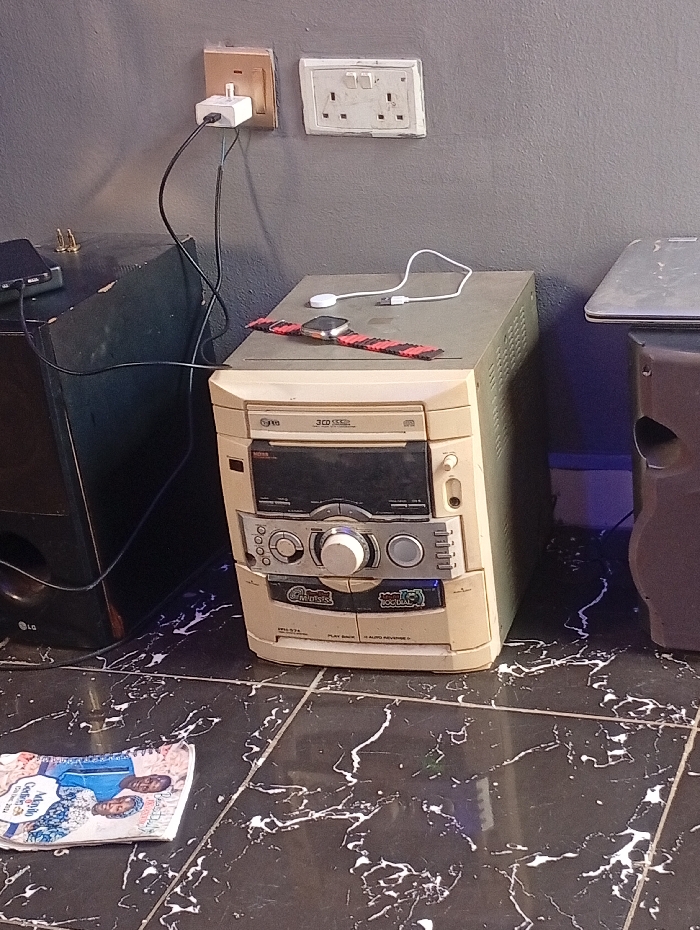 An indoor scene in Unknown, Unknown, displays various electronic devices against a grey wall and on a black tiled floor with white marbling. To the left, a large, dark speaker, branded "LG" at its base, has a dark, rectangular electronic device resting on its top surface. A black cable runs from this device to a white wall charger plugged into a beige, single electrical outlet mounted on the grey wall. Adjacent to this outlet is a white, double electrical socket, which remains unoccupied. In the center foreground, a beige compact stereo system, model MDSS-574, features a "3 CD CHANGER" tray, a cassette deck with "PLAY BACK / AUTO REVERSE" functionality, and a central control panel with a large silver knob and buttons labeled "GROOVES" and "SOUND EQ." Resting on the top surface of this stereo system is a silver smartwatch with a red and black striped fabric strap, positioned next to a white wireless charging cable. To the right of the stereo system, a portion of a silver-colored laptop or similar flat electronic device is visible on a dark surface, behind which a dark, possibly brown or grey speaker or cabinet is partially obscured. A subtle blue light emanates from behind this right-side speaker. On the black tiled floor in the lower-left foreground, a folded piece of paper or magazine page displays an image of two individuals (a man and a woman) in traditional attire, with text partially visible, including "Melody G..." and "Classic...".