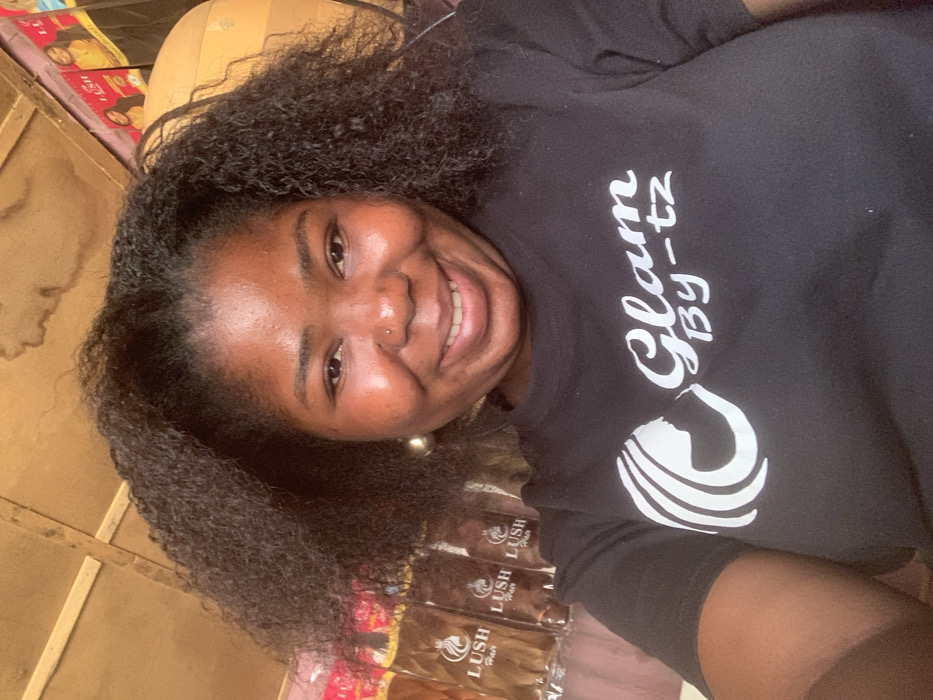 An adult female, positioned centrally, smiles directly at the camera. She has dark skin, dark curly hair, a nose piercing on her left nostril, and a single gold-colored spherical earring on her left ear. She wears a black t-shirt featuring a white logo depicting a woman's profile and the text "Glam By-tz." The background to her left displays multiple brown packages of "Lush Hair" brand hair extensions, arranged vertically. To her right, additional retail packaging or posters are partially visible. The overhead structure consists of a wooden ceiling with visible discoloration and wooden beams. The scene is located within a retail establishment, likely a beauty supply shop or market stall, in Garaku, Nigeria.