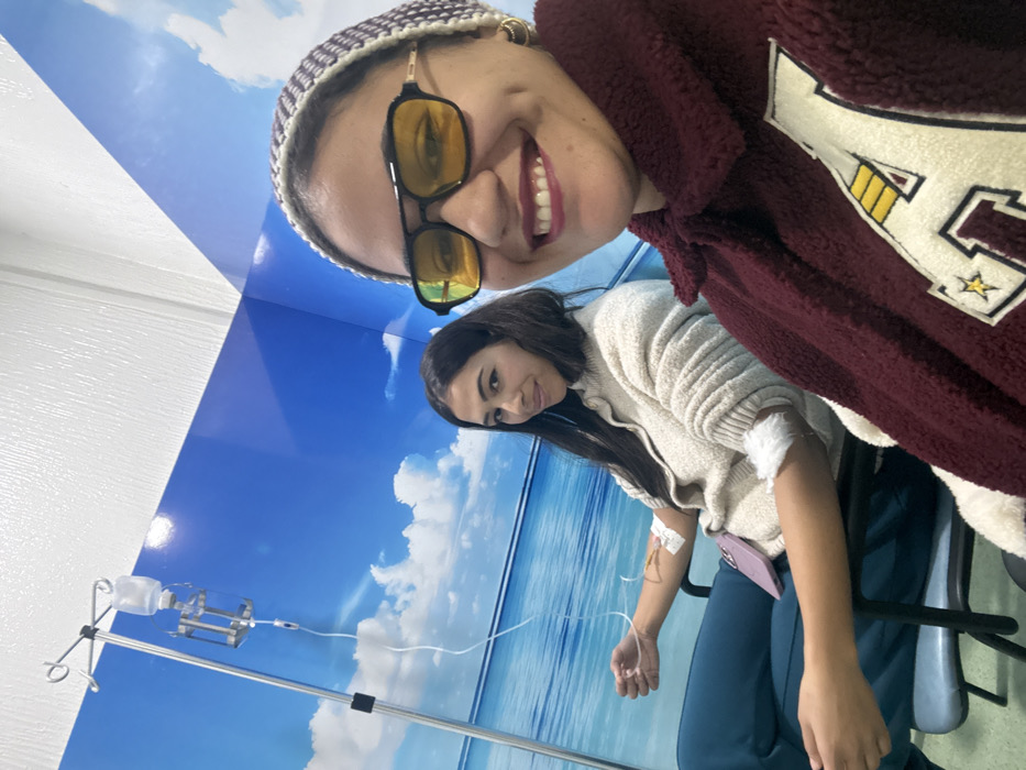 The image depicts two adult females inside a medical facility in Meknes, Morocco. The interior features walls adorned with a large mural depicting a blue sky with white clouds over a calm ocean. On the left side of the frame, a metal IV drip stand holds a clear bag of intravenous fluid, from which tubing extends to the left forearm of the woman seated in the left chair. This woman has dark hair and is wearing a light-colored, textured sweater and dark pants. A small bandage covers the IV insertion site on her left arm, and a larger white bandage or gauze is wrapped around her right forearm. A light purple phone in a case rests on her lap. She smiles slightly, looking directly at the camera. In the foreground, partially obscuring the woman on the left, a second woman is seated, smiling broadly at the camera. She wears a striped beanie, black-framed glasses with yellow-tinted lenses, and a maroon fuzzy jacket with a large cream-colored "A" patch on the front. Her lips are covered in maroon lipstick. The environment suggests a clinic or hospital room, potentially for IV therapy. The precise location or address within Meknes cannot be determined from the visual evidence.
