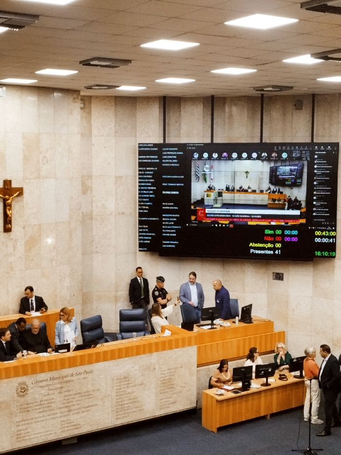 The interior of the Câmara Municipal de São Paulo features a chamber with rows of desks and seated figures. A large screen displays live video of a meeting, along with voting statistics indicating "Sim" (yes) and "Não" (no) votes are both at zero, no abstentions, and 41 members present. Timers are visible on the screen as well. A golden cross is mounted on the left wall. Several people are standing and conversing near the desks in the foreground.