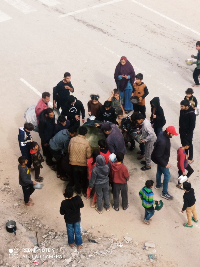 - "An overhead view depicts approximately thirty individuals, comprising adults and numerous children, gathered around a large, dark, irregularly shaped container on an unpaved area adjacent to a light-colored asphalt road in Khan Yunis, Palestinian Territory" by FM-iymI62, licensed under CC BY 4.0