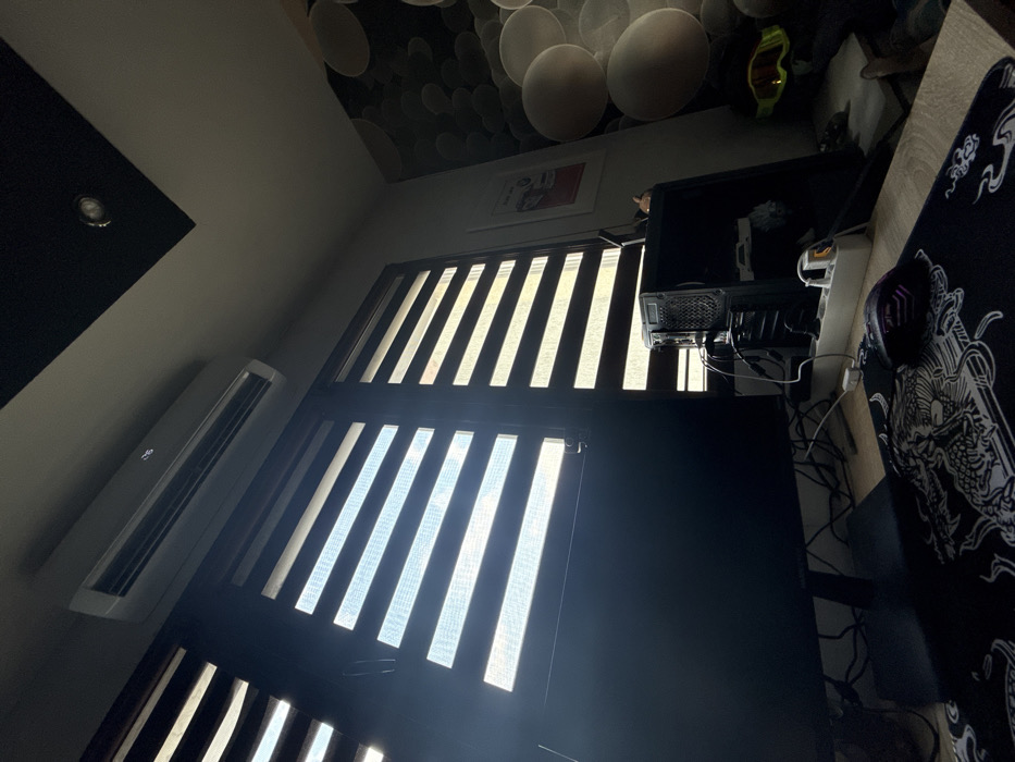 The image depicts an indoor scene within a room in Dimitrovgrad, Bulgaria, focused on a computer workstation during daylight hours. **Environment:** The room features a light-colored ceiling with a black square panel containing a single recessed downlight. A white air conditioning unit, displaying the number "26," is mounted high on a wall above two window sections. The windows are fitted with horizontally striped "zebra" blinds, partially open, allowing natural light to filter through in alternating bright and shaded bands. To the right, a wall is adorned with a wallpaper or mural featuring numerous overlapping, light-colored spherical shapes. A white-framed picture with red graphic elements is mounted on this wall. **Objects and Setup:** A light-colored wooden desk occupies the foreground. On the desk, a large, black computer monitor stands centrally, its screen dark. To the right of the monitor, a black desktop computer tower with a perforated front panel is visible. Multiple cables are connected to the rear of the tower and routed towards a white power strip that lies on the desk, into which a white power adapter is plugged. A black gaming mouse with multi-colored LED illumination rests on a black mouse pad featuring an intricate white dragon design. Partially visible beneath the computer tower and to its right are a pair of yellow-lensed goggles. No individuals are present, nor are any actions or interactions depicted.