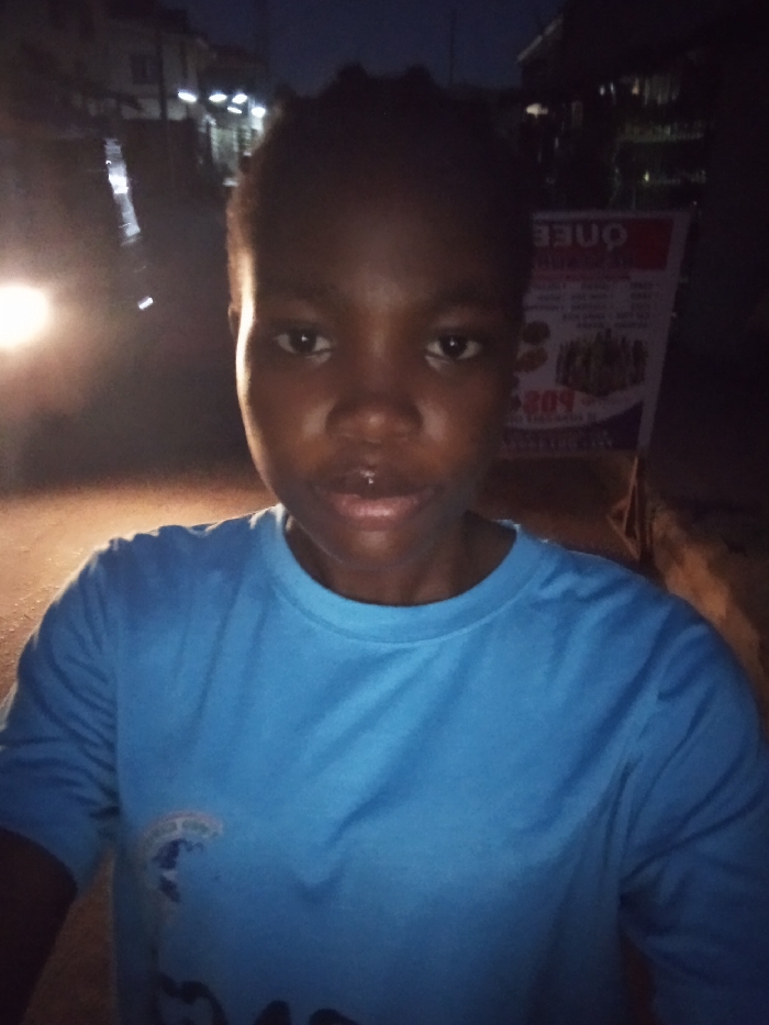 A person with short dark hair and a blue t-shirt is centered in the frame. The background is dark, appearing to be outdoors at night, with a blurred streetlight to the left and an unreadable sign to the right. The person's face is directly facing the camera, and the overall lighting is dim, giving the image a slightly grainy appearance.