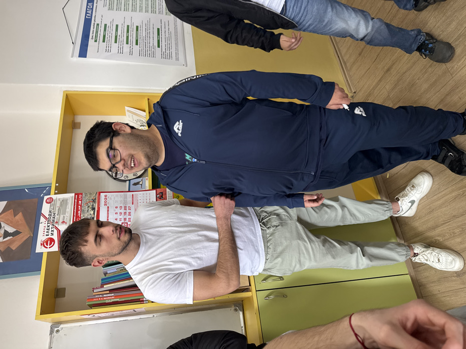 The image depicts an indoor scene in Ihtiman, Bulgaria, showing four males interacting within what appears to be a classroom or communal educational space