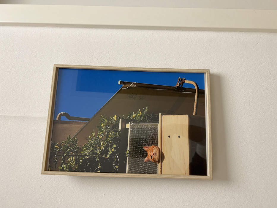 - "A framed photograph is mounted vertically on a textured, off-white wall, adjacent to a white doorframe or trim on its right" by FM-XmLYN2, licensed under CC BY 4.0