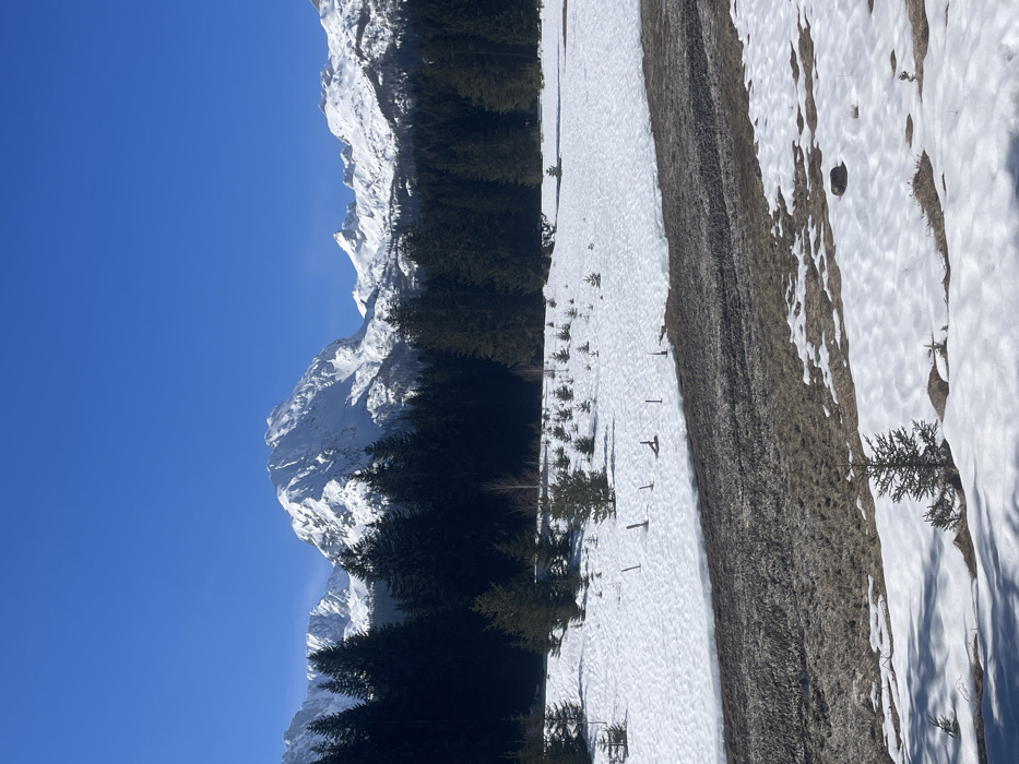 The scene depicts a panoramic outdoor landscape in Pitomine, Montenegro, under a clear, cloudless blue sky. In the background, a range of rugged, snow-capped mountains is visible, with a prominent, brightly illuminated peak centrally located and extensively covered in white snow. A dense, dark green coniferous forest forms a horizontal band in the midground, separating the mountains from the foreground. The foreground consists primarily of a snow-covered field exhibiting patches of melting, revealing dark brown earth and dry, flattened vegetation. A distinct, irregular strip of exposed ground and sparse dry grass cuts horizontally through the mid-foreground. Numerous small evergreen saplings are scattered across the snow and exposed ground. Several short, dark wooden posts or stakes protrude from the snow and earth in the mid-foreground. No human figures, animals, or significant man-made structures are present. The scene is illuminated by bright daylight.