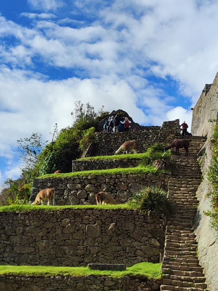 A hillside with stone terraces, likely ancient ruins. Lush grass grows on each level, with a herd of llamas grazing. A steep stone staircase ascends the right side, where a person stands near the top. Above the terraces, a group of people is gathered at the peak. A vibrant blue sky with puffy white clouds forms the backdrop. The stones are grey and varied in size, indicating old construction.