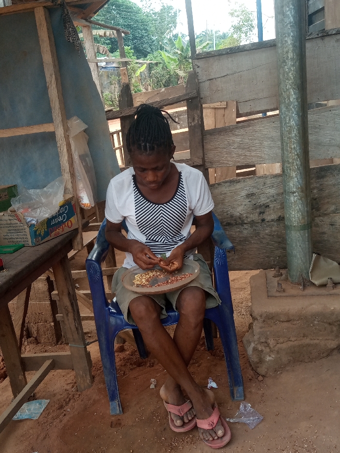 A woman seated on a blue plastic chair is peeling peanuts. She wears a black and white striped shirt, khaki shorts, and pink sandals. She holds a clear plate with peanuts in various states of being peeled. The scene is outdoors, with a wooden structure in the background and a metal pole to the right. The ground is dirt. Part of a table with a box of Cream Crackers on it is visible to the left.