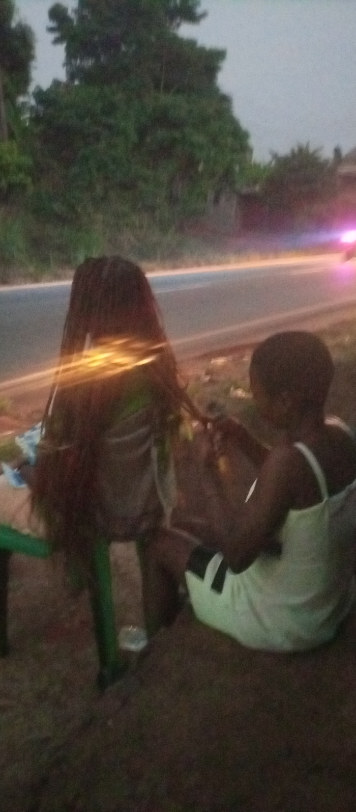 A person braids dark hair extensions on a mannequin head outdoors at dusk. The person is wearing a light-colored top. They are seated on the ground. The mannequin head is on a green stool. A road is visible in the background with a blurred vehicle passing by. Trees and foliage are also visible in the background. The lighting is dim and the image has a grainy quality.