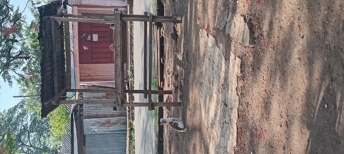 A weathered wooden structure with a slanted roof stands beside a dirt path. The roof overhangs a small, open-air stall or shelter. A two-story corrugated metal building with a faded red door is behind the structure. Trees are on the left. A white and brown cat is in the foreground, near the side of the dirt path. The path has patches of cracked asphalt. Bright sunlight casts strong shadows.